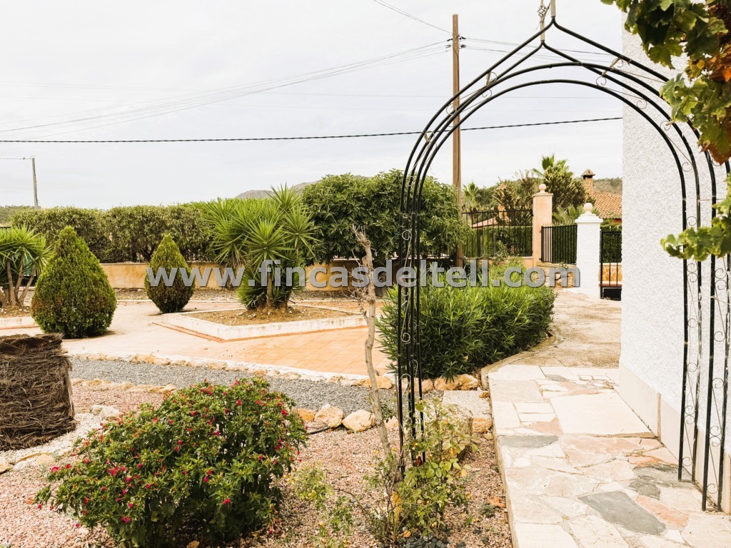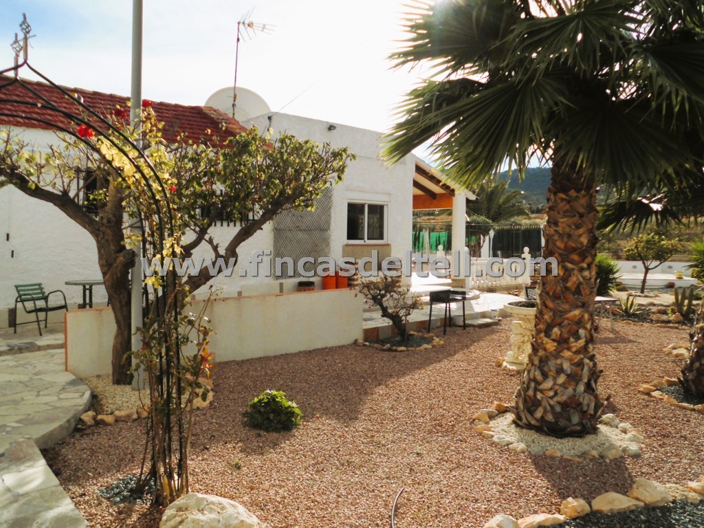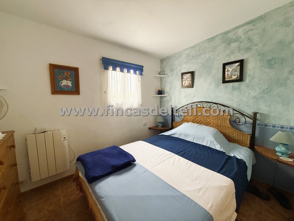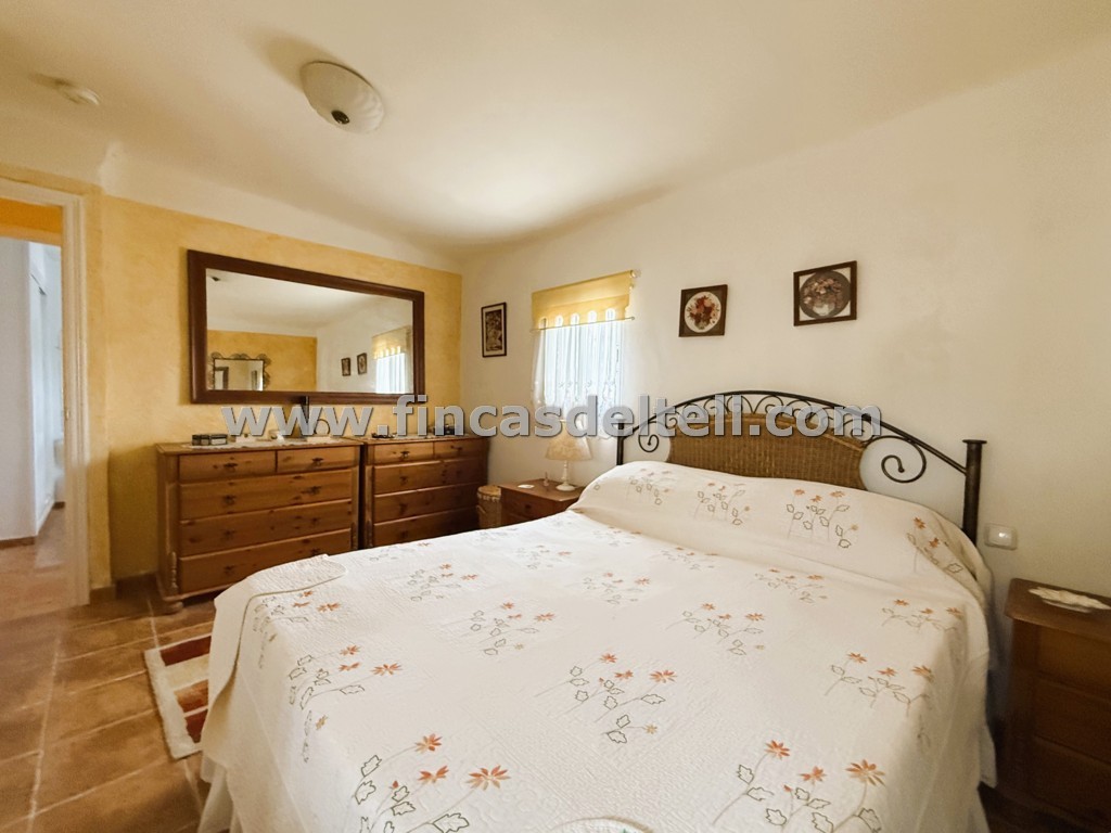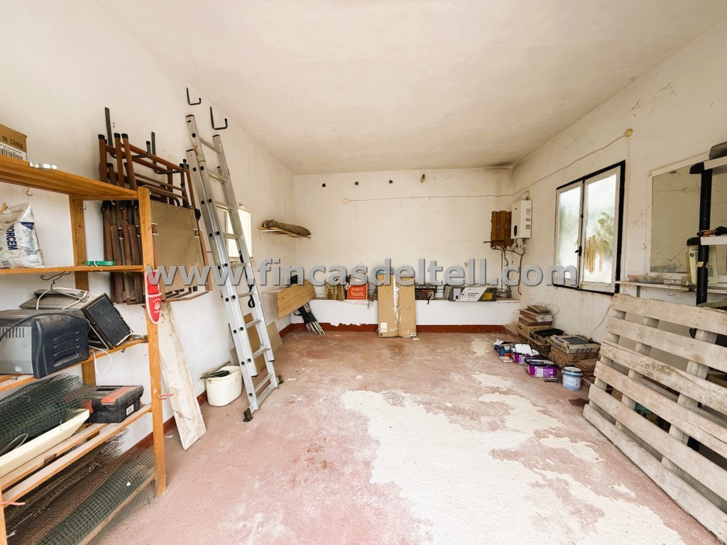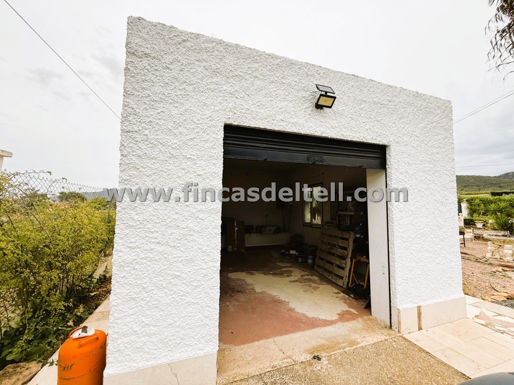 The single-storey house has a large porch overlooking the garden, 1 spacious kitchen with a wood-burning stove and dining area, 1 living room with a wood-burning fireplace, 3 bedrooms, 2 bathrooms and 1 toilet. Next to it is a storage room used as a laundry room and storage room and a small swimming pool, and there is also a garage. It has a constructed area of 181 m2 including the swimming pool.
