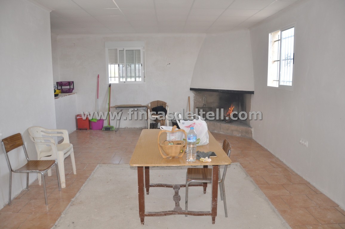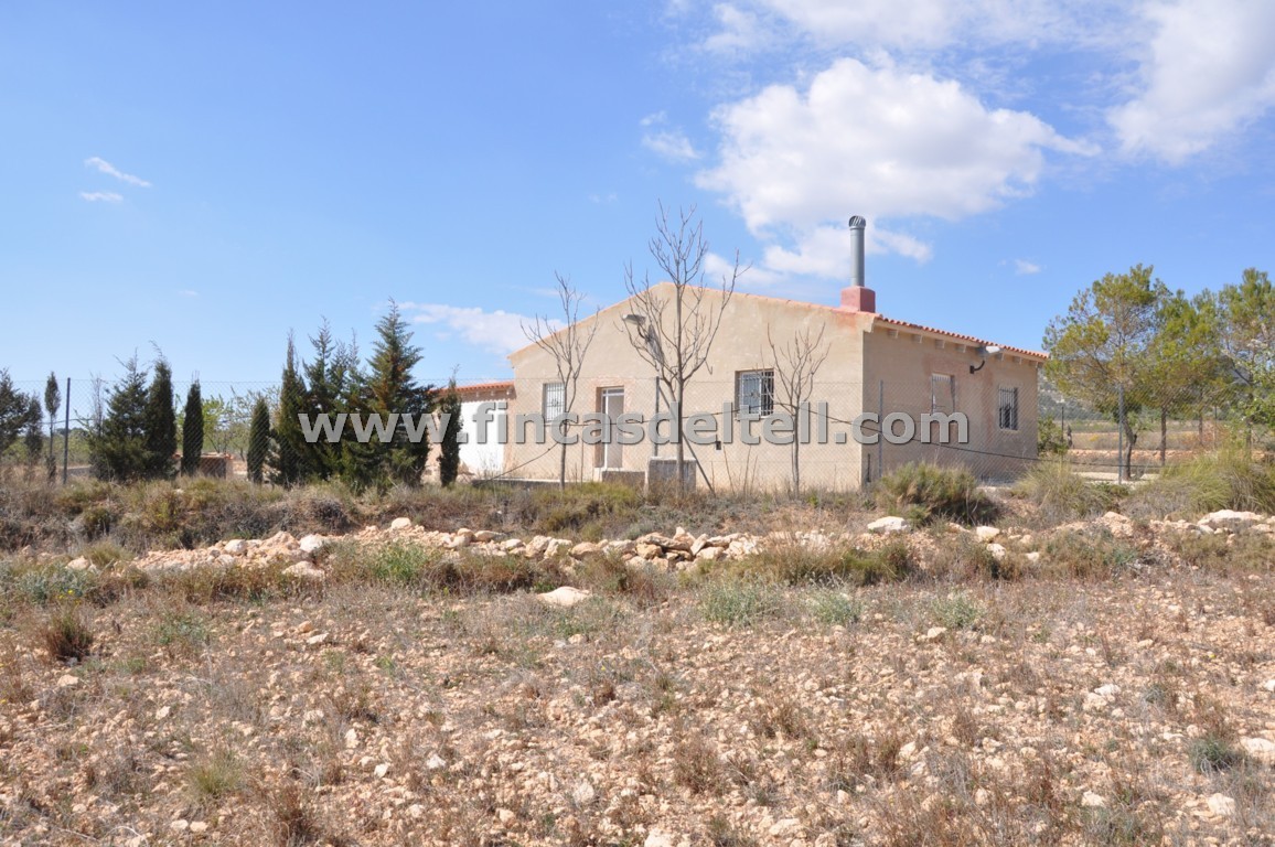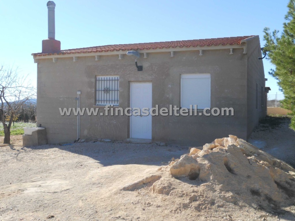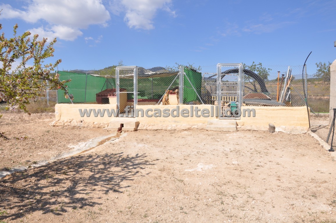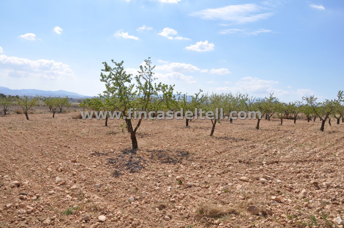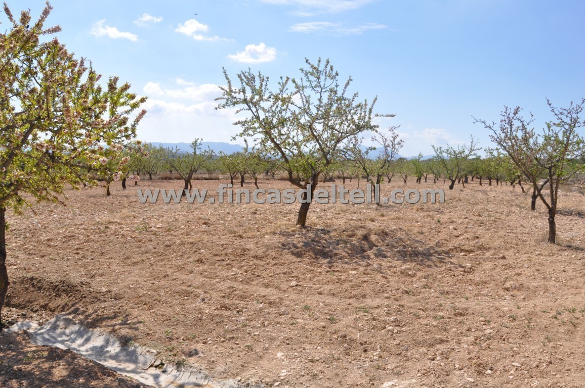 The land has 20.538 m2, of which about 10.000 m2 are fenced and planted with almond trees and the rest is uncultivated and unfenced. The house has 100 m2 and has 3 bedrooms, 1 bathroom, kitchen/living room with fireplace and a garage of 38 m2. There is another fenced area with a dog house. It has electricity and mains water.