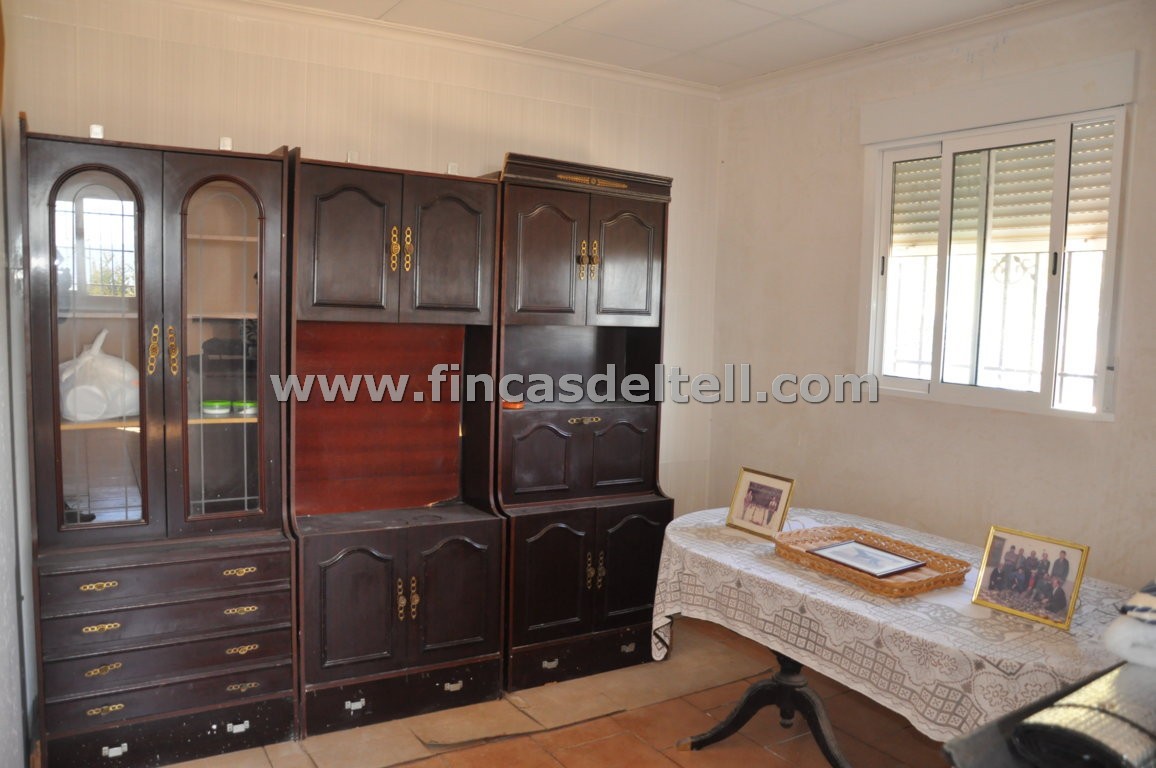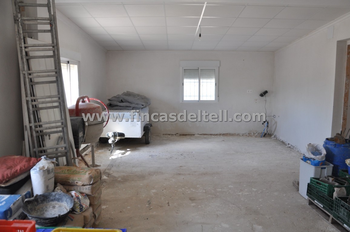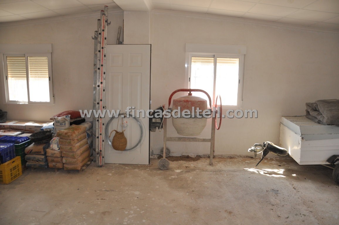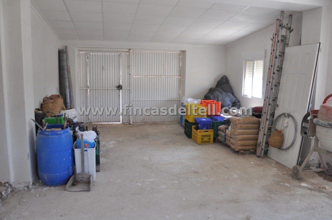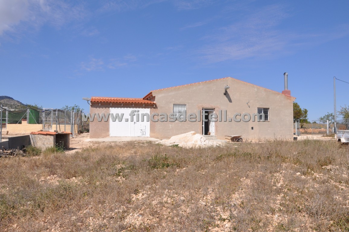 The land has 20.538 m2, of which about 10.000 m2 are fenced and planted with almond trees and the rest is uncultivated and unfenced. The house has 100 m2 and has 3 bedrooms, 1 bathroom, kitchen/living room with fireplace and a garage of 38 m2. There is another fenced area with a dog house. It has electricity and mains water.