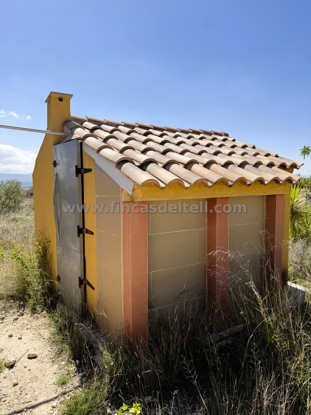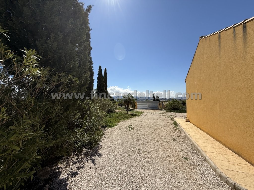 The land has an area of 10,100 m² and is fully enclosed by a brick wall, featuring an electric gate for vehicles at the entrance and a separate pedestrian access point at the front. The rest of the property is enclosed by a metal fence. It features a landscaped garden area, with the remainder planted with almond and olive trees. There is also a fenced-off area with a kennel for the dogs.