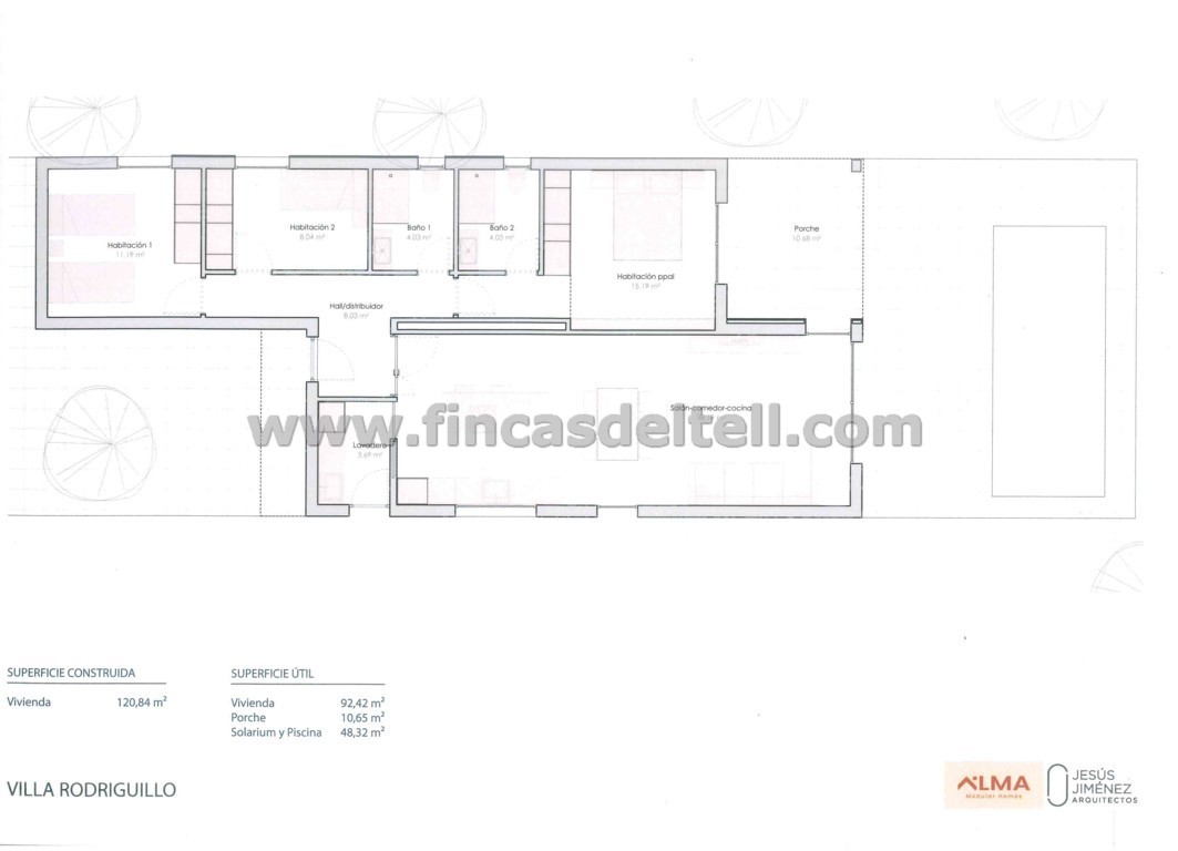 Newly built detached villa with swimming pool in the heart of the peaceful hamlet of El Rodriguillo. Villa Rodriguillo is a development designed for those who value quality of life, privacy, and exclusivity. Villa Rodriguillo offers peace and seclusion in a privileged natural setting, without sacrificing the convenience of essential services provided by Pinoso, just 5 km away. There you will find shops, leisure activities, restaurants, schools, a health center, and other amenities necessary for daily life. The villa features an entrance hall, 3 bedrooms, 2 bathrooms, a laundry room, a living-dining room, a kitchen, a porch, and a swimming pool. All finished to the highest standards.